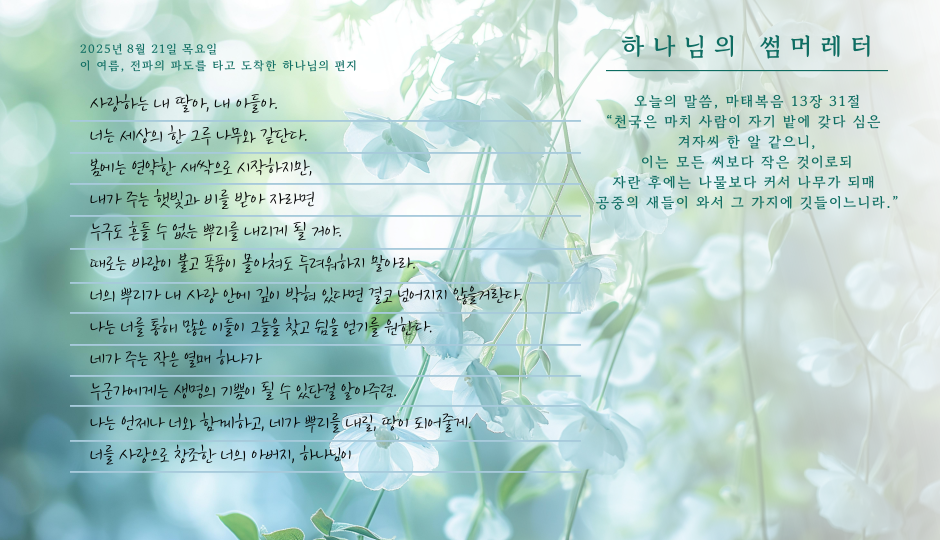 [사랑의뜰안] 8월 21일 목요일, 하나님의 썸머레터