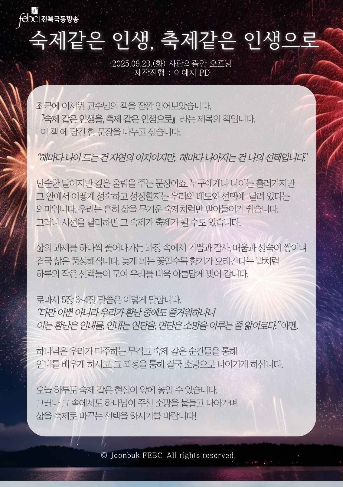 [전북] 25.09.23.(화) 사랑의뜰안 오프닝 "숙제 같은 인생, 축제 같은 인생으로!"