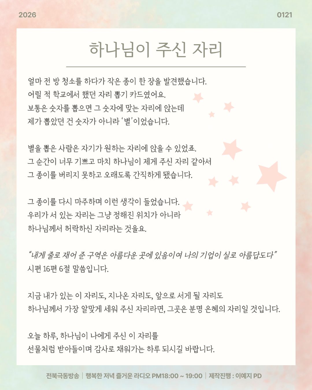 2026년 1월 21일 오프닝 [ 하나님이 주신 자리 ]