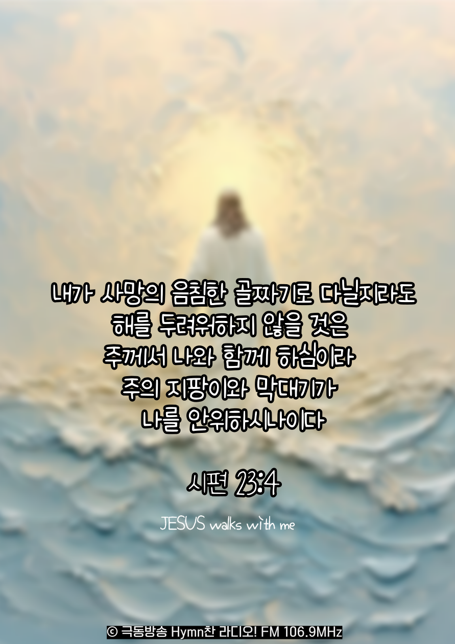내가 사망의 음침한 골짜기로 다닐지라도 해를 두려워하지 않을 것은 주께서 나와 함께 하심이라 주의 지팡이와 막대기가 나를 안위하시나이다
